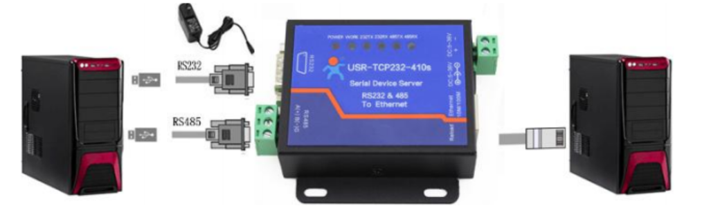 1. 將 410S(USR-TCP232-410S,簡稱 410S 下同)的串口通過串口線(或USB 轉(zhuǎn)串口線)與計(jì)算機(jī)相連接,通過網(wǎng)線將 410S 的網(wǎng)口 PC 的網(wǎng)口相連接,檢測(cè)硬件連接無錯(cuò)誤后,接入我們配送的電源適配器,給 410S 供電。觀察指示燈狀態(tài)確定410S是否正常工作:POWER燈常亮,WORK燈閃爍。