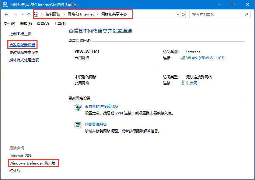2. 按路徑:控制面板》網(wǎng)絡(luò)和Internet》網(wǎng)絡(luò)和共享中心找到“windows防火墻”和“更改適配器設(shè)置”選項(xiàng),關(guān)閉防火墻并禁用與本次測(cè)試無關(guān)的網(wǎng)卡,并關(guān)閉電腦殺毒軟件。