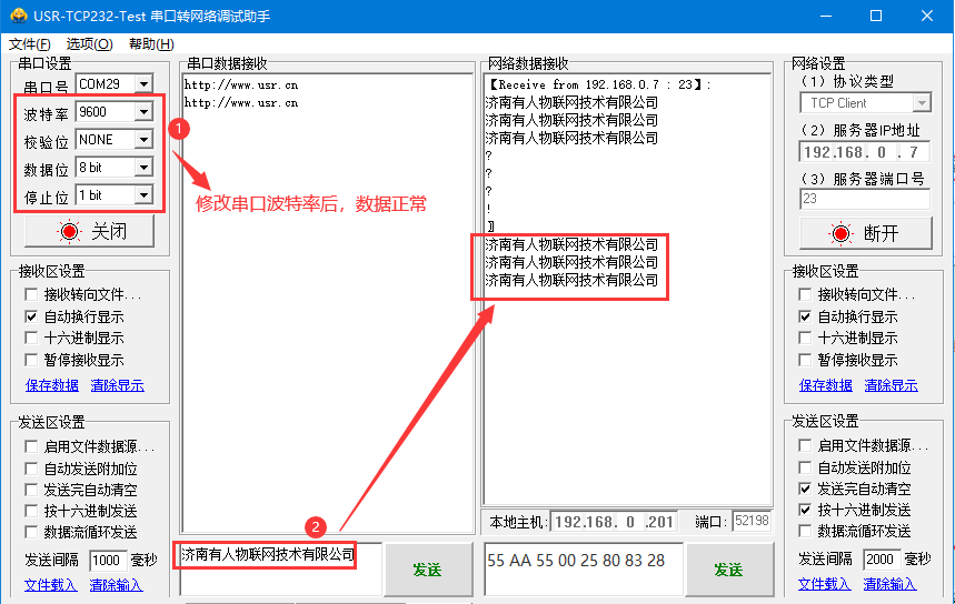 410s現(xiàn)串口參數(shù)為115200、NONE、8、1, 將模塊串口參數(shù)修改為9600、NONE、8、1通信, 需要在網(wǎng)絡(luò)端按十六進(jìn)制下發(fā)55 AA 55 00 25 80 83 28, 發(fā)送完成后,軟件打開串口需要修改為9600、none、8、1, 不然數(shù)據(jù)會(huì)顯示為亂碼。 注意:本命令所作的修改立即生效,不需要重啟,當(dāng)次有效,不會(huì)保存,斷電丟失。