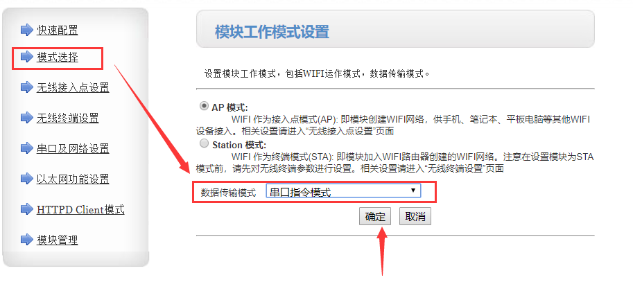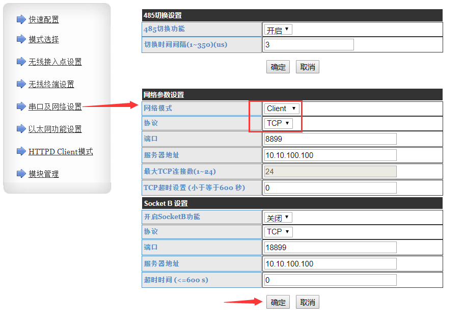 2、電腦瀏覽器地址欄輸入模塊默認IP:10.10.100.254,賬號和密碼都是admin,進入內置網頁,模式選擇 -> 數據傳輸模式 -> 串口指令模式,點擊確定,串口及網絡設置 -> 網絡參數設置 -> 網絡模式配置為client,點擊確定,重啟模塊。