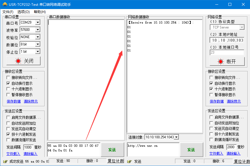 7、依據協議確定要往服務器發送有效數據:01。