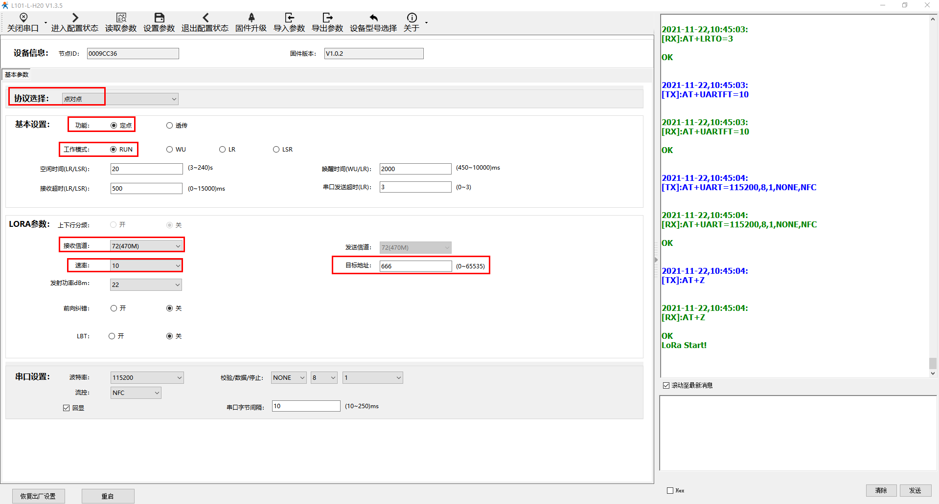 上電第一次,用默認串口參數打開串口COM4,點擊進入配置狀態,讀取參數。然后設置定點功能,信道72,速率10,目標地址666。最后點擊設置參數。