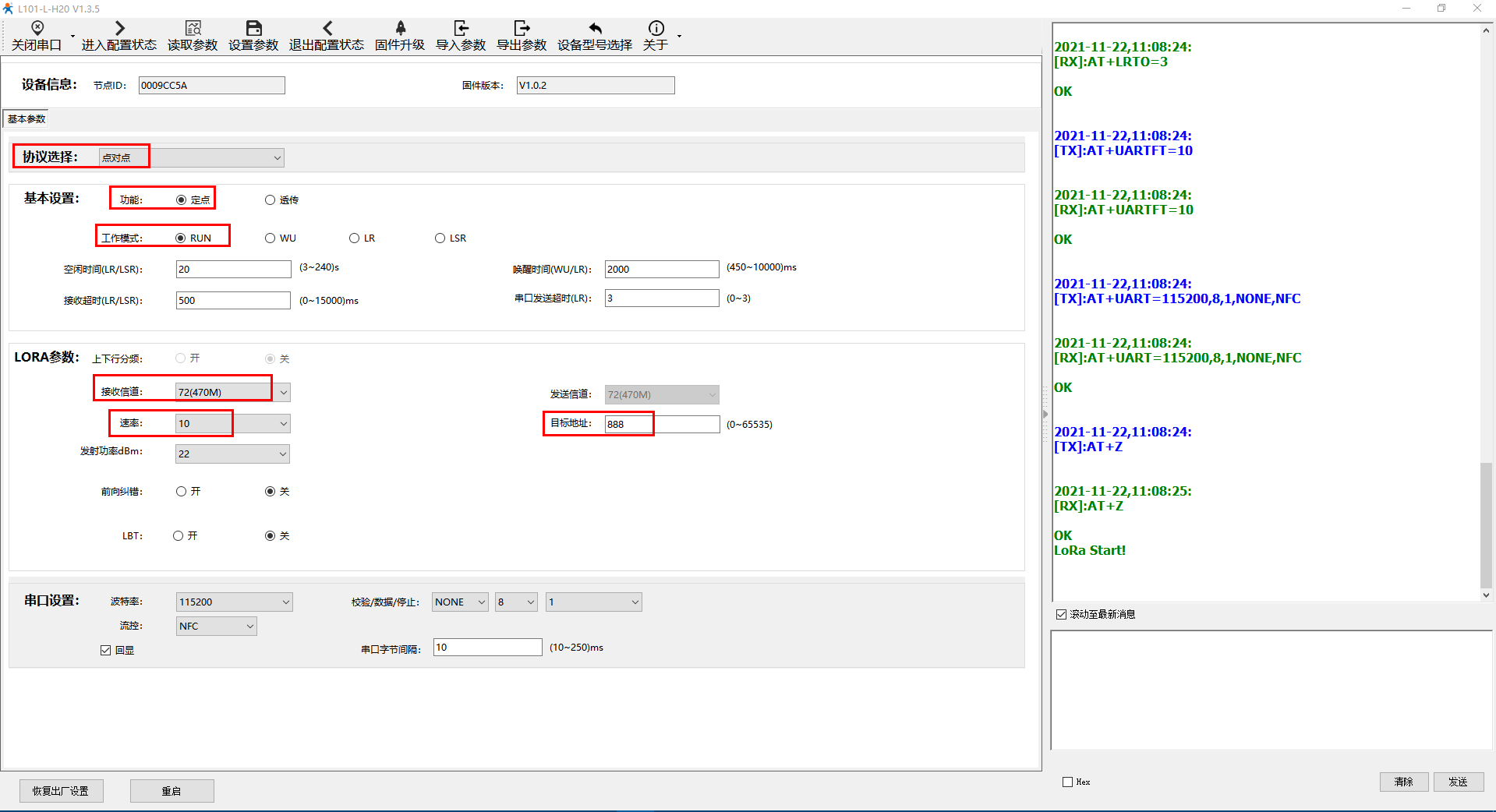 第一次上電,用默認串口參數打開串口COM7,點擊進入配置狀態,讀取參數。然后設置定點功能,信道72,速率10,目標地址888。最后點擊設置參數。