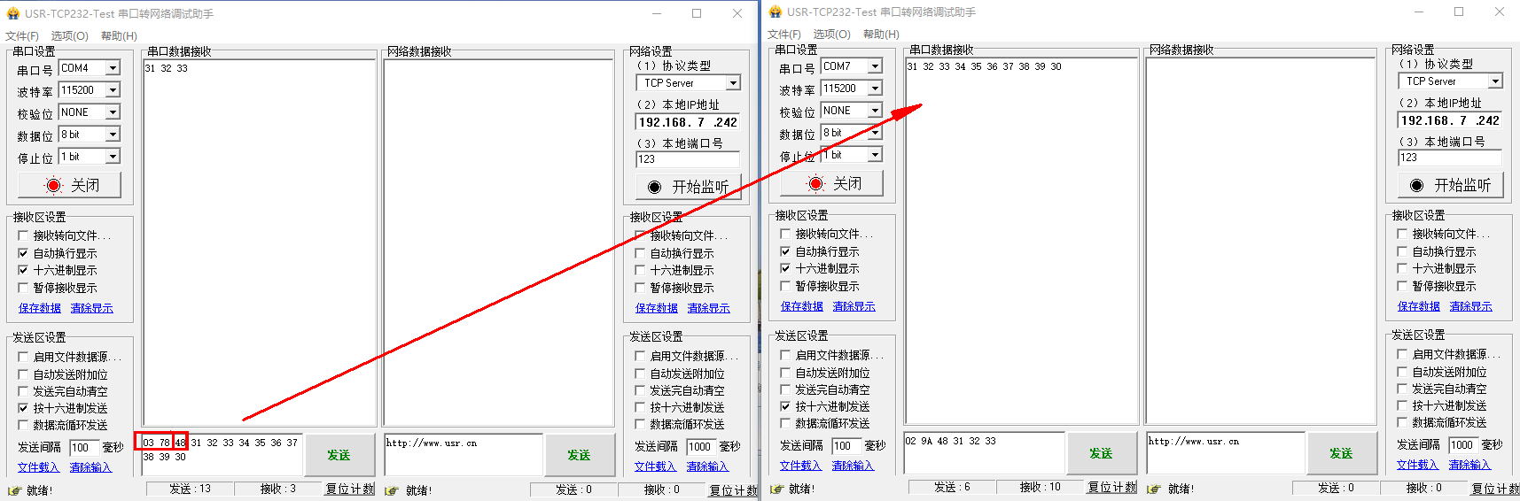 第一個串口助手,勾選十六進制發送數據,數據內容為:目標地址+信道+數據。