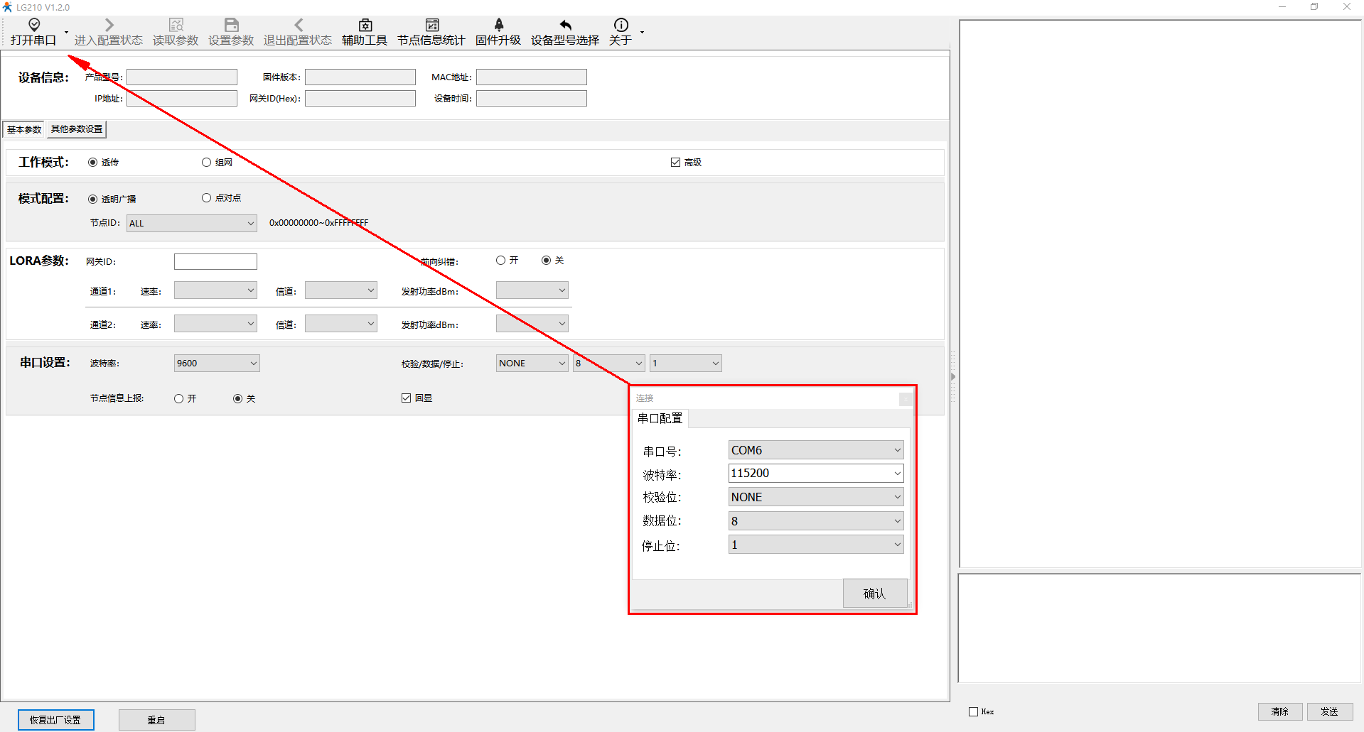 1、電腦打開USR-LG210的設置軟件,打開串口,點擊進入配置狀態,讀取參數。