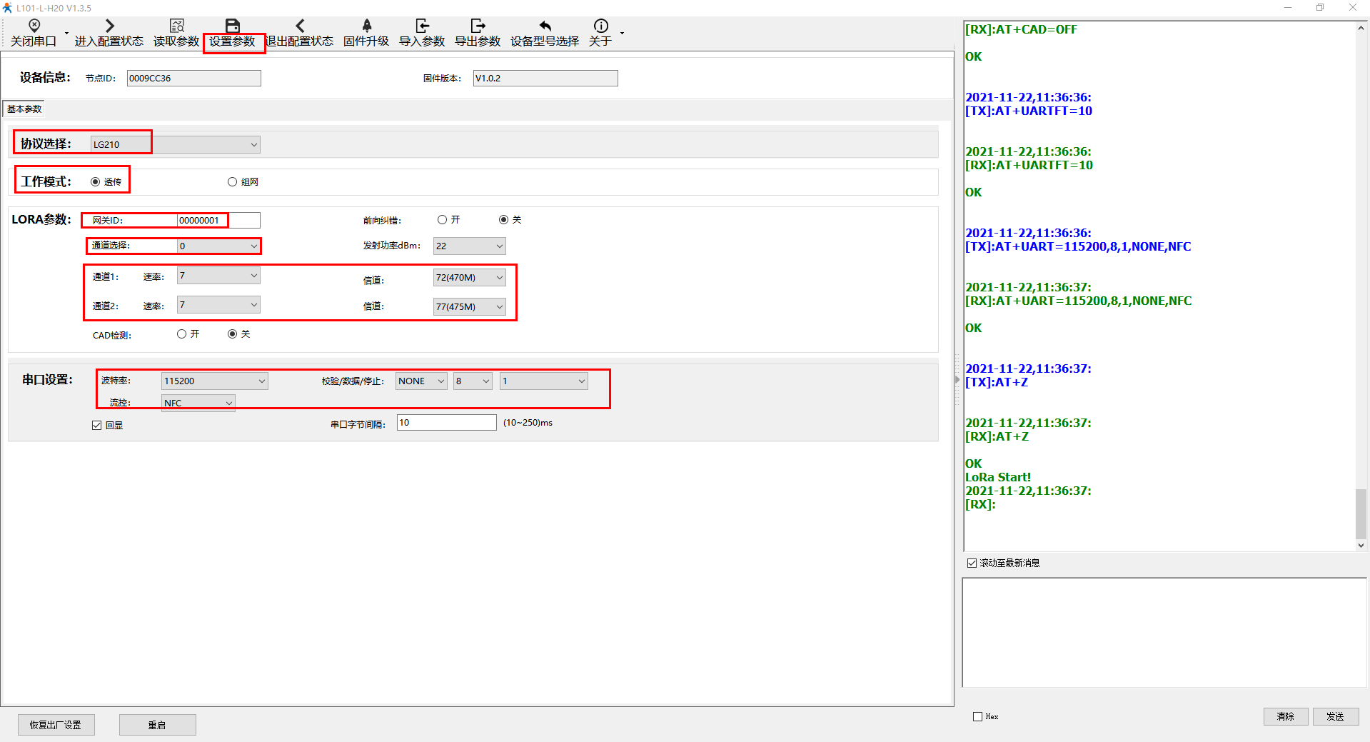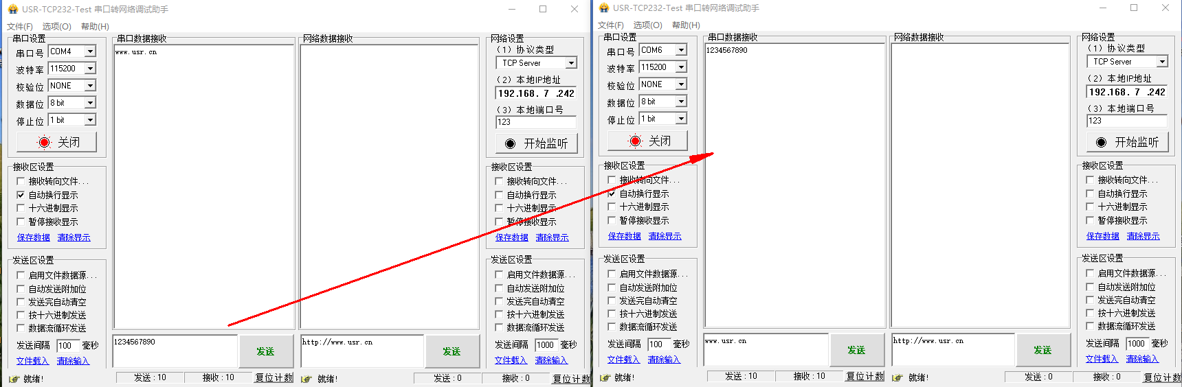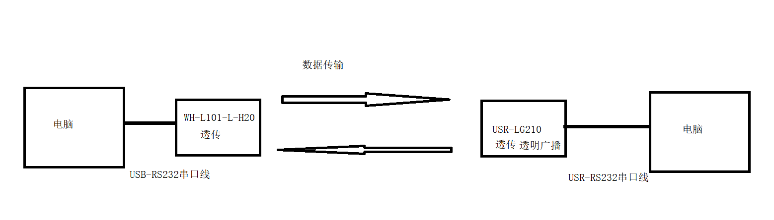 電腦打開2個USR-TCP232-TEST串口軟件,打開對應WH-L101-L-H20和USR-LG210的USB-RS232串口線COM口號,WH-L101-L-H20串口發送數據,USR-LG210串口接收數據。