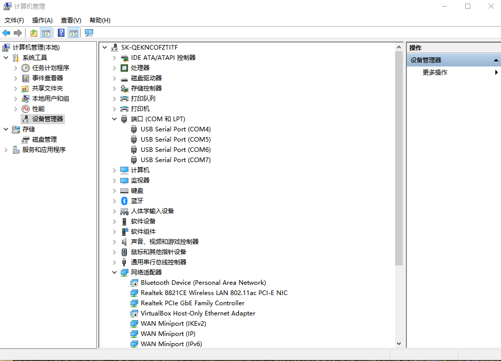 電腦鼠標點擊計算機管理,右擊,點開設(shè)備管理器,點擊端口,查看接WH-L101-L-H20和USR-LG210的USB-RS232串口線COM口號。