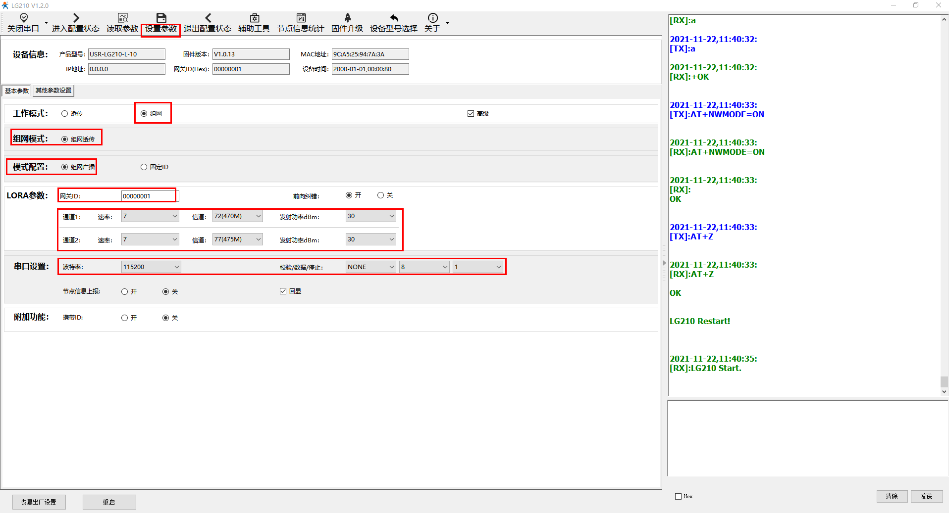 電腦打開2個USR-TCP232-TEST串口軟件,打開對應(yīng)WH-L101-L-H20和USR-LG210的USB-RS232串口線COM口號,USR-LG210串口發(fā)送十六進制數(shù)據(jù),數(shù)據(jù)前面帶節(jié)點ID,WH-L101-L-H20串口接收十六進制數(shù)據(jù)。這樣USR-LG210可以指定向WH-L101-L-H20發(fā)送數(shù)據(jù)。
