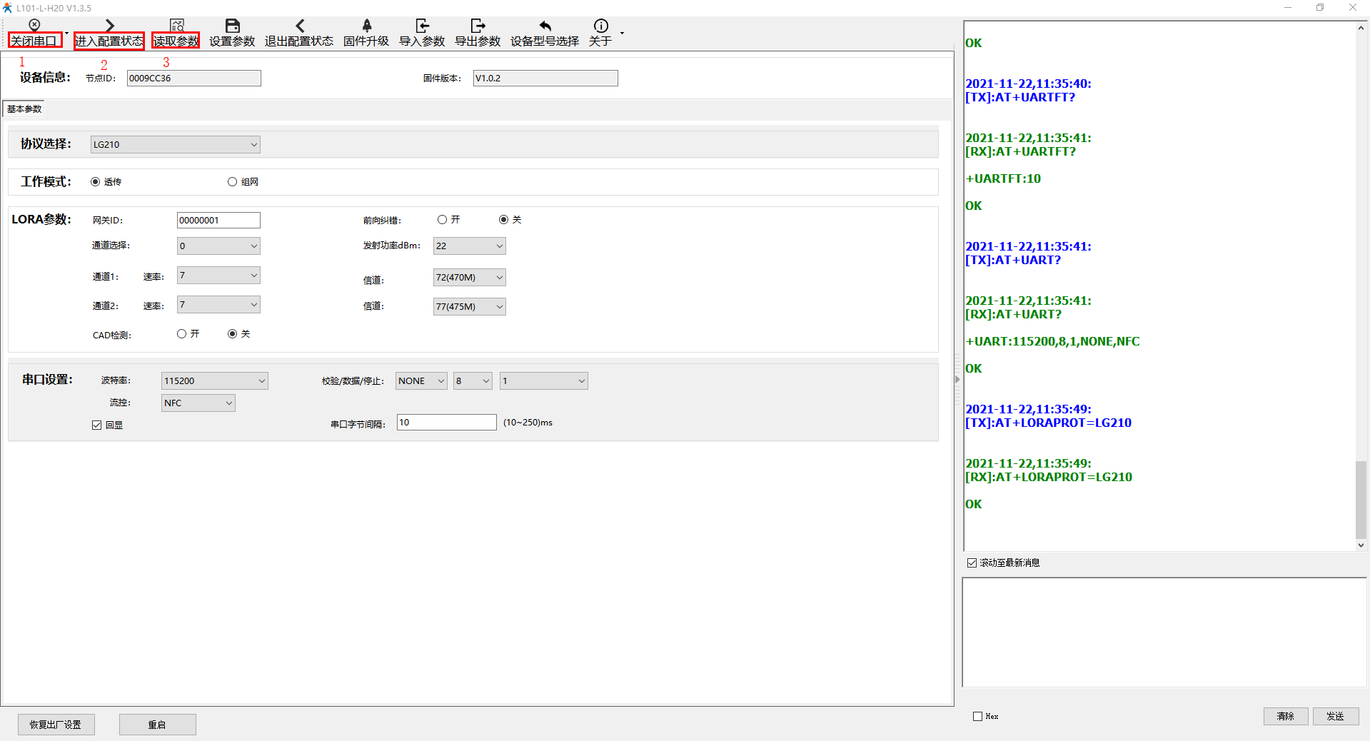 2、用默認串口參數(shù)打開串口COM4,點擊進入配置狀態(tài),讀取參數(shù)。