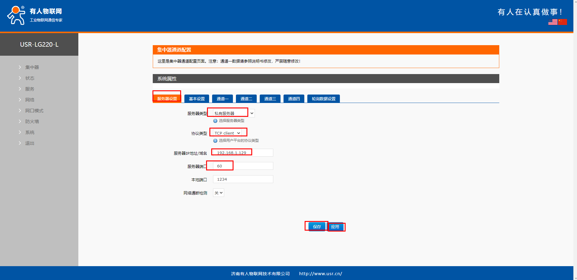 2、配置USR-LG220服務器設置