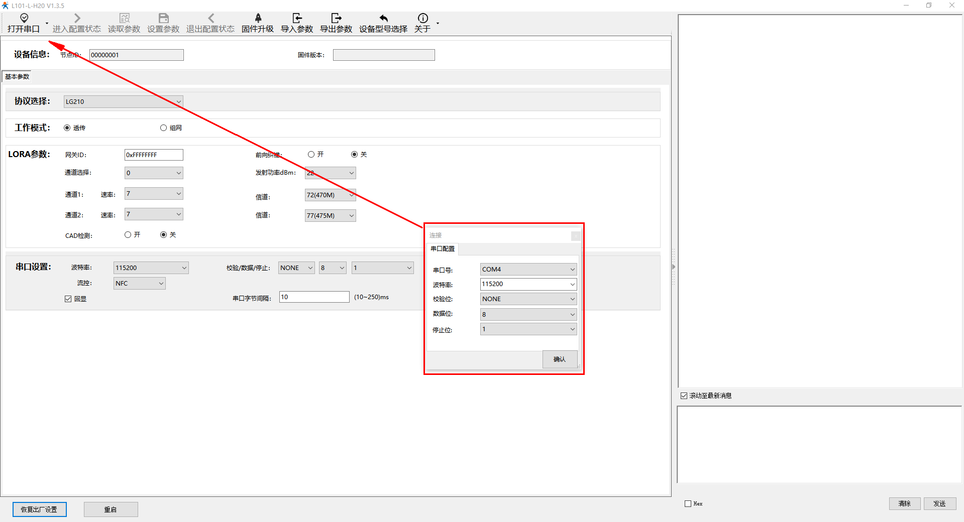 2、用默認串口參數打開串口COM4,點擊進入配置狀態,讀取參數。