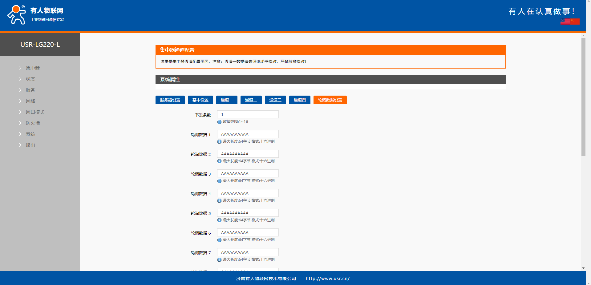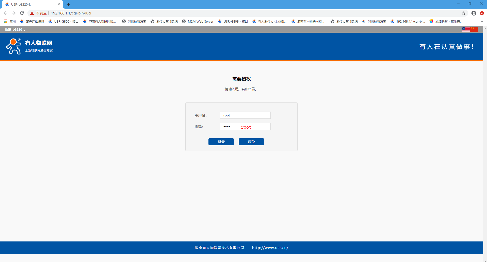 瀏覽器輸入USR-LG220默認IP,192.168.1.1,密碼是root ,登錄USR-LG220內置網頁。