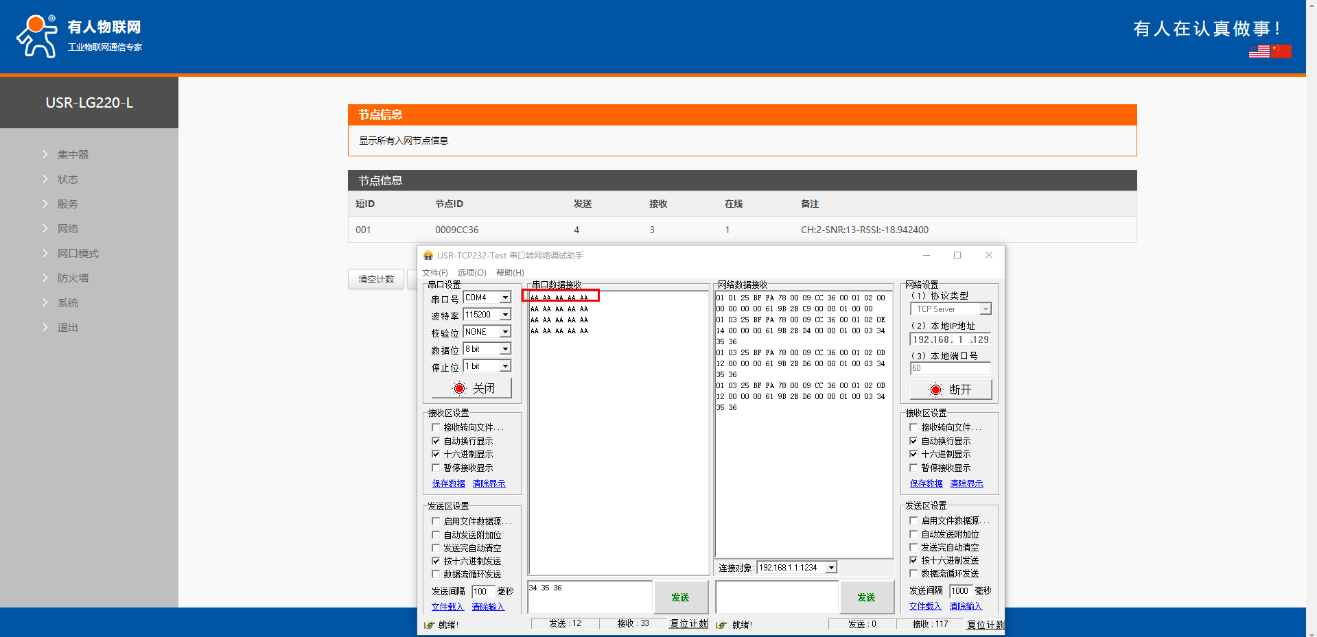 登錄USR-LG220內置網頁,可以查看節點信息,確認節點是否入網到USR-LG220