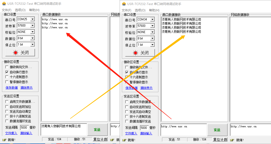 關(guān)閉AT指令設(shè)置軟件的串口后打開串口測試軟件,可以進(jìn)行數(shù)據(jù)透傳通信測試。