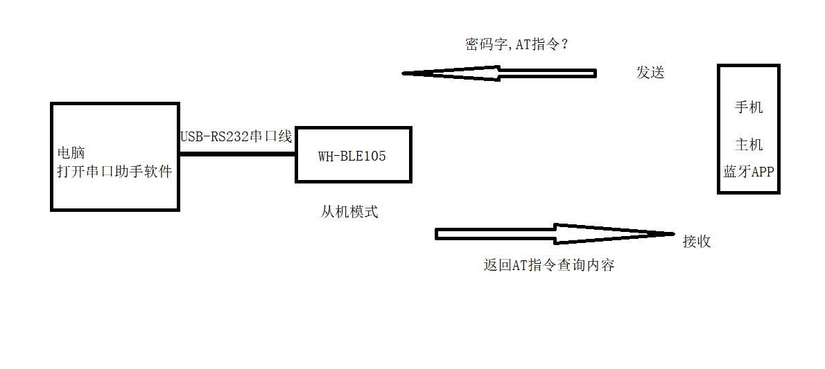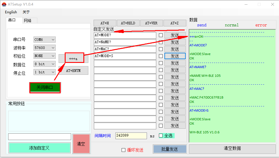 電腦打開串口AT指令設置軟件,查詢WH-BLE105的MAC,設置從機模式。