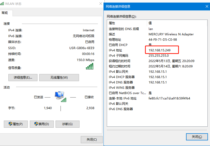 5. 待設備重啟成功后,重新查看電腦獲取的IP,變成192.168.15.249,網關為192.168.15.1,瀏覽器輸入192.168.15.1進入配置網頁。