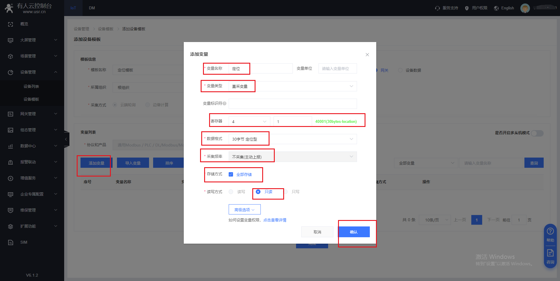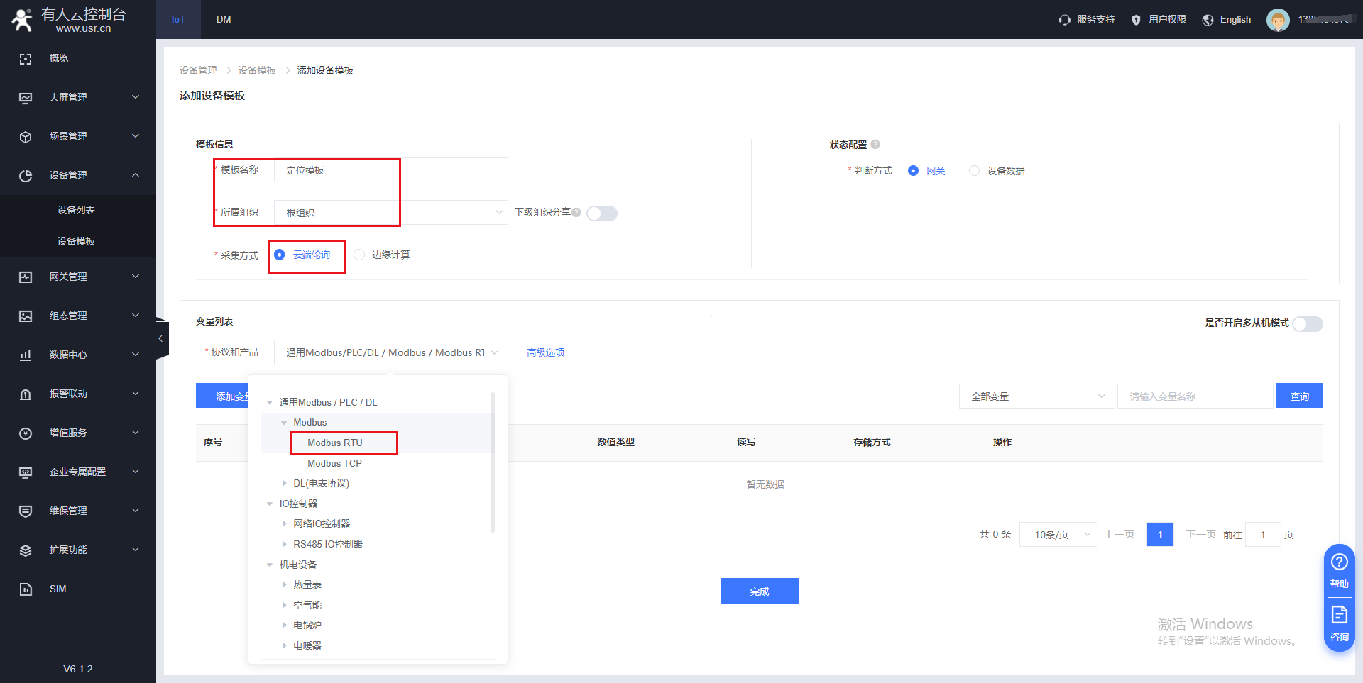(2)在設備管理---設備模板界面添加需要采集的從機變量點