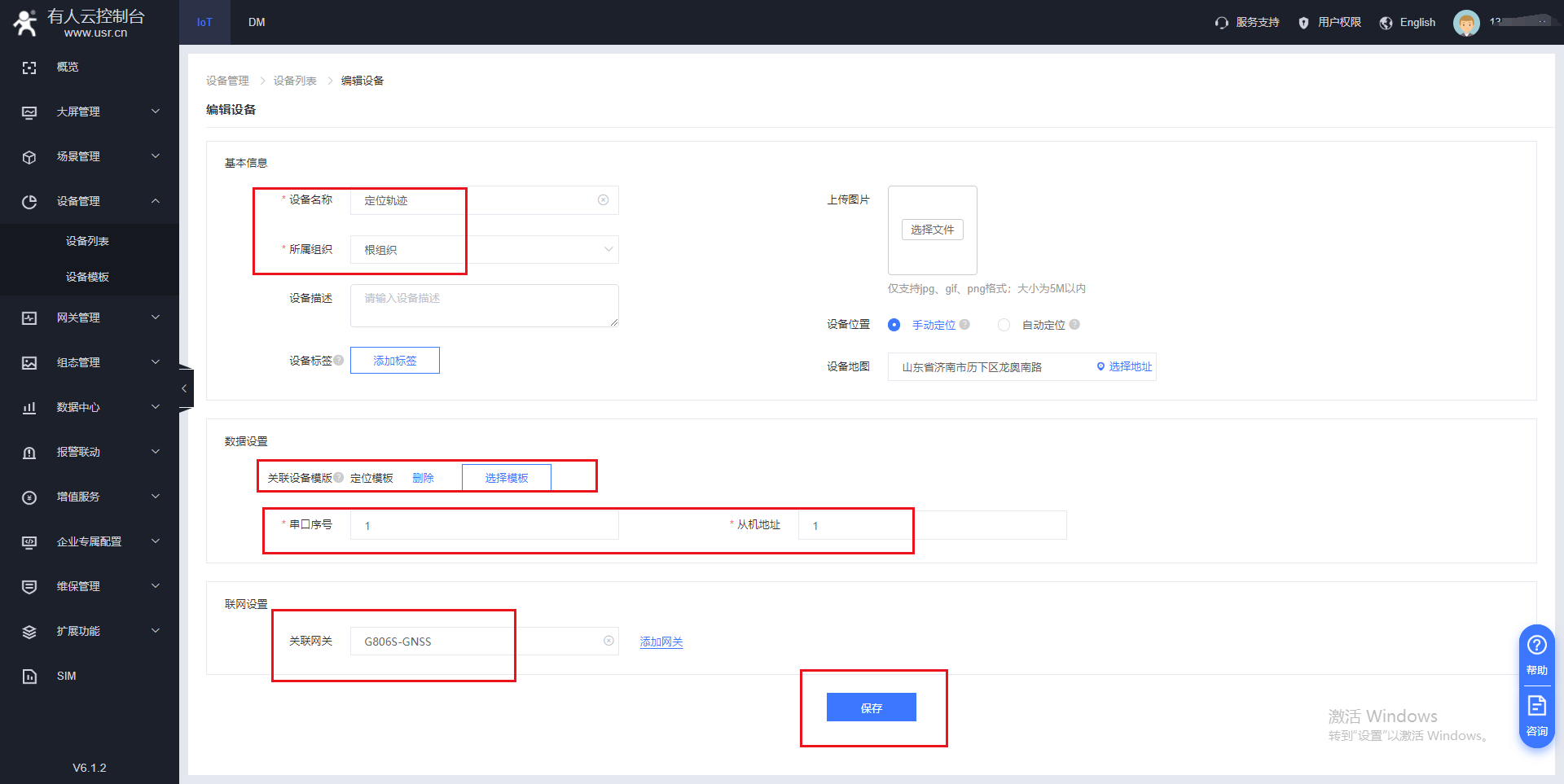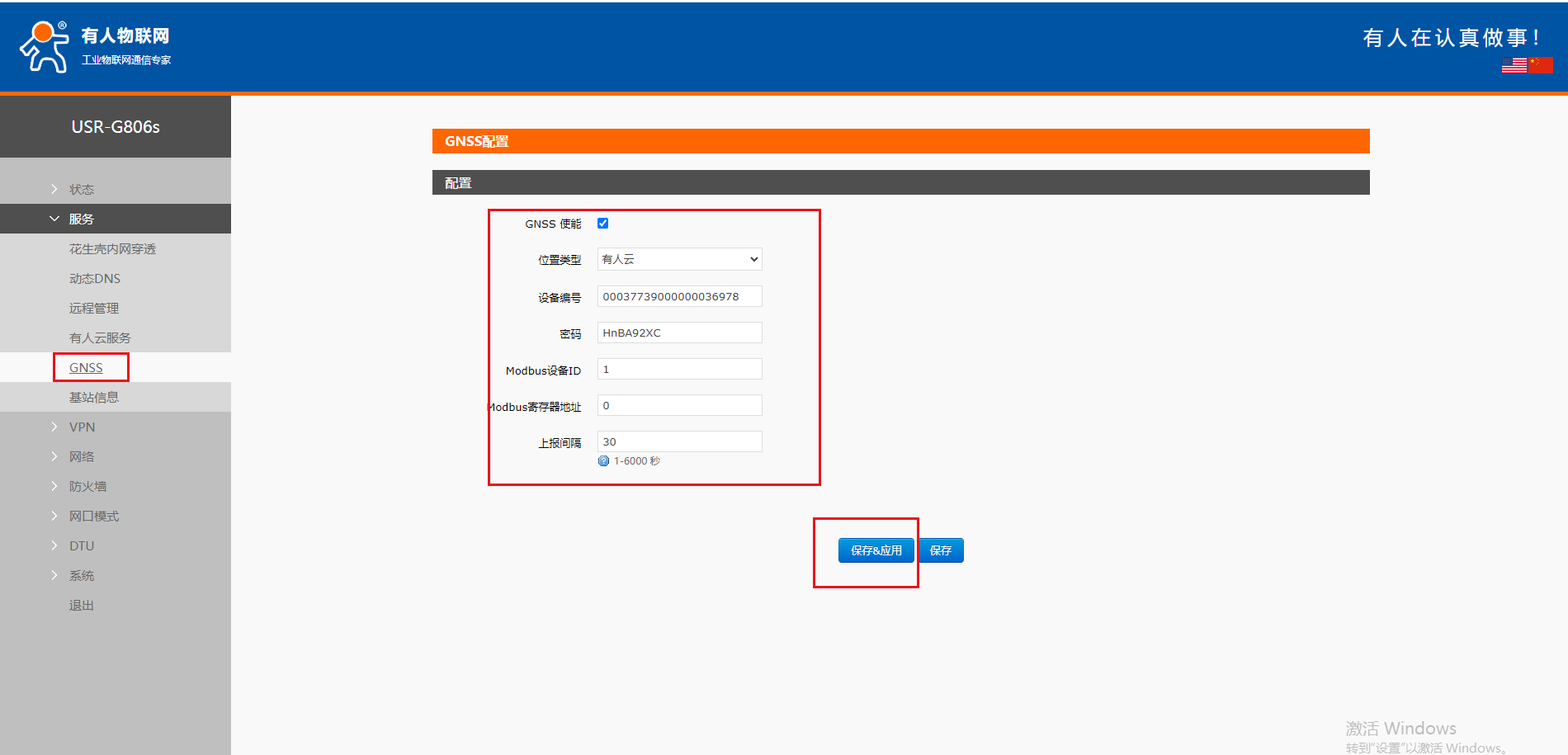 4、設置G806s-GNSS的注冊包信息,設備編號和密碼、云端接入地址都可以在云平臺查詢