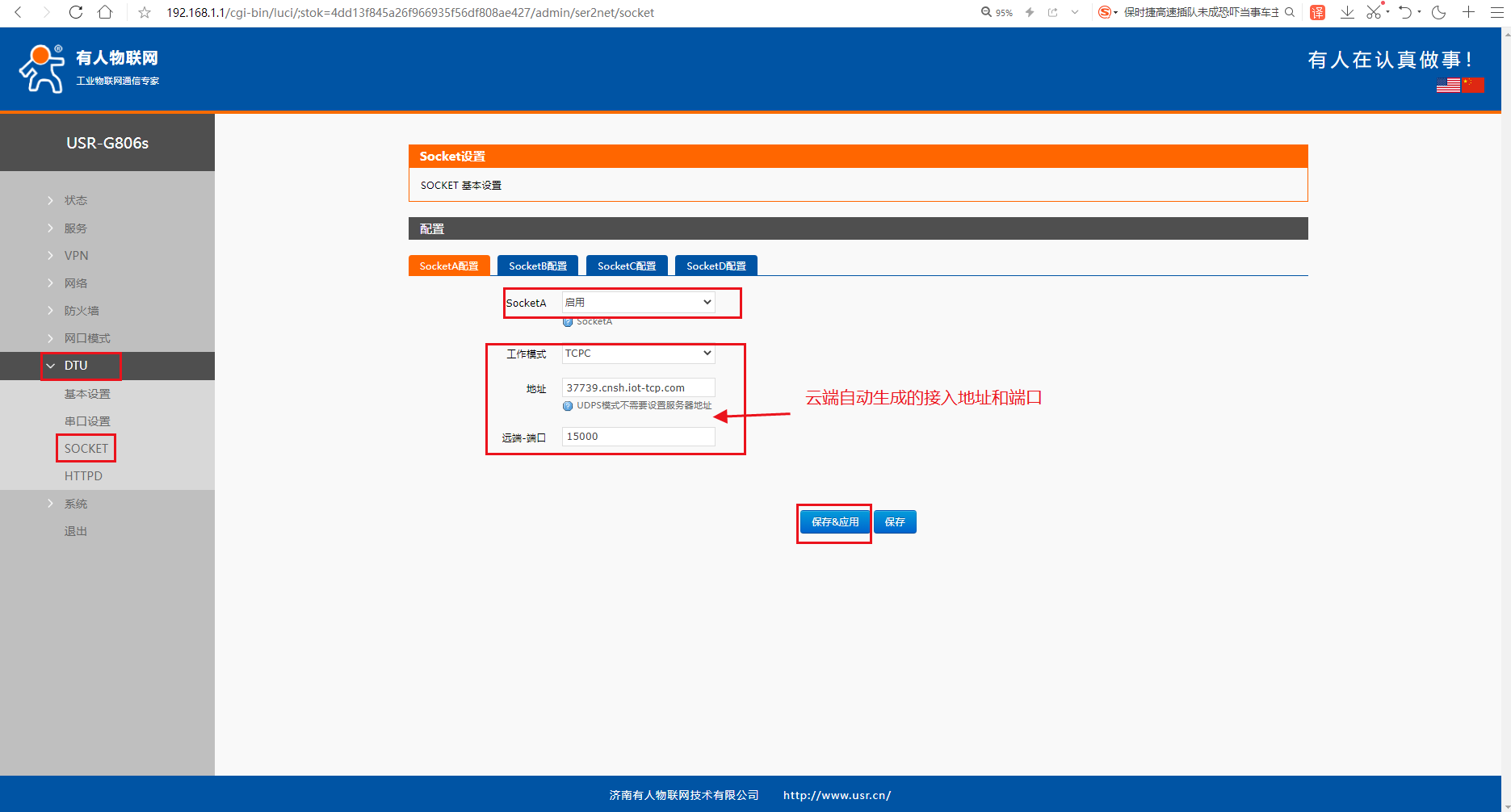 開啟SOCKET功能,設置有人云的IP地址(云端自動生成的接入地址)以及端口號(15000),然后點擊應用