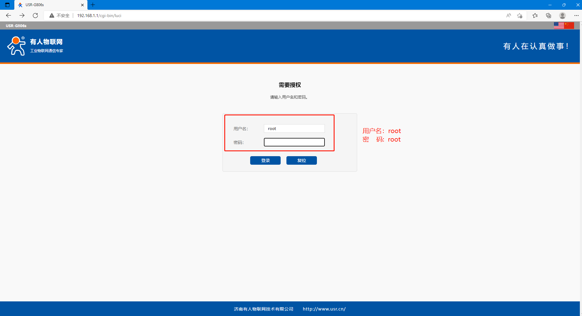 在瀏覽器上輸入192.168.1.1,用戶名和密碼都是root,登錄G806的內置網頁