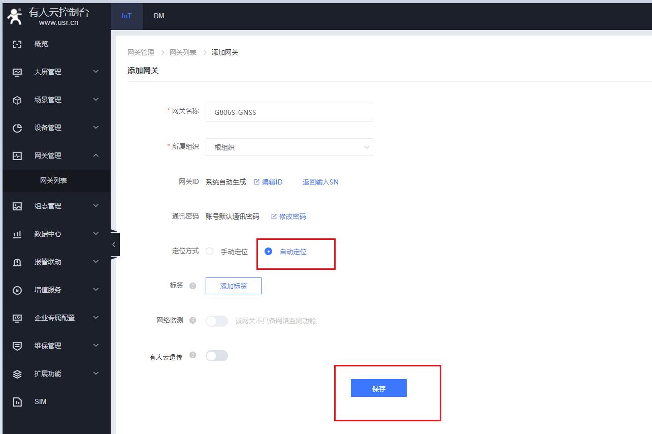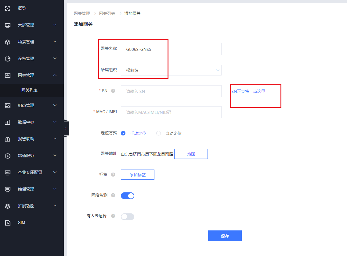 (1)云平臺添加網關,在網關管理---網關列表--添加,點擊SN不支持,系統自動生成,不需要客戶自己設置,通訊密碼可以自定義8位密碼.(建議使用系統自動生成的通訊密碼),定位方式——自動定位,保存