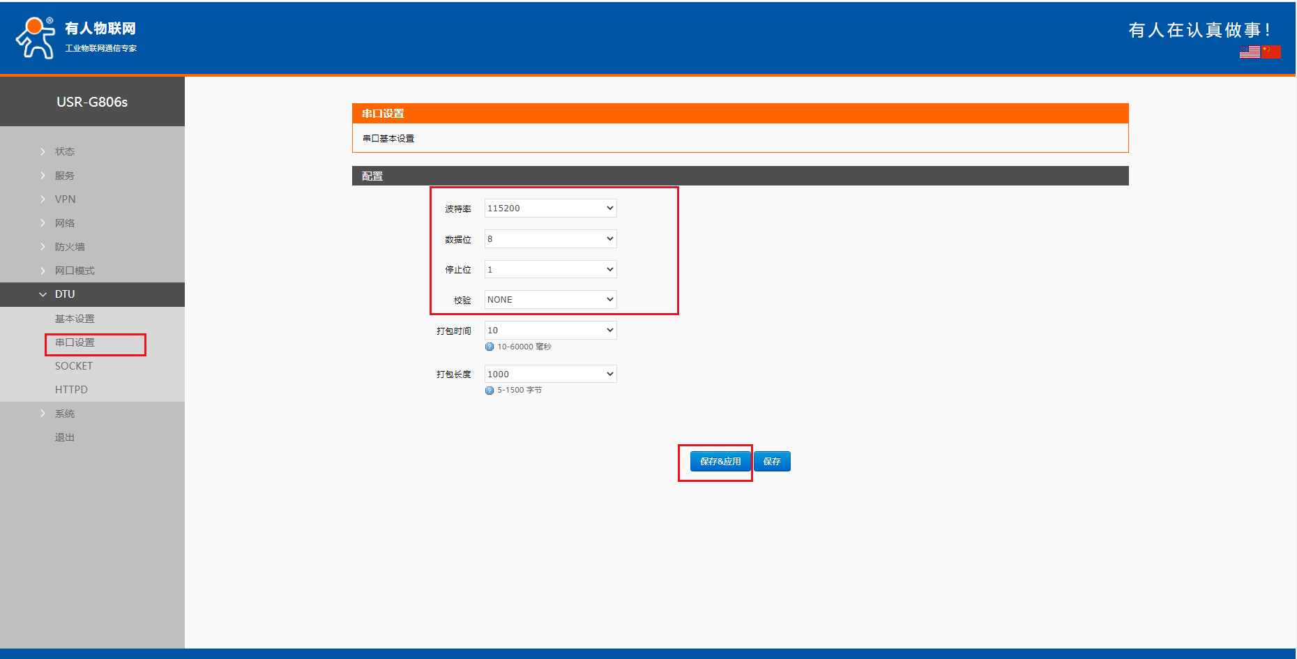 在DTU---串口設置,修改G781的串口參數和要接的485設備一致,測試默認用出廠的。