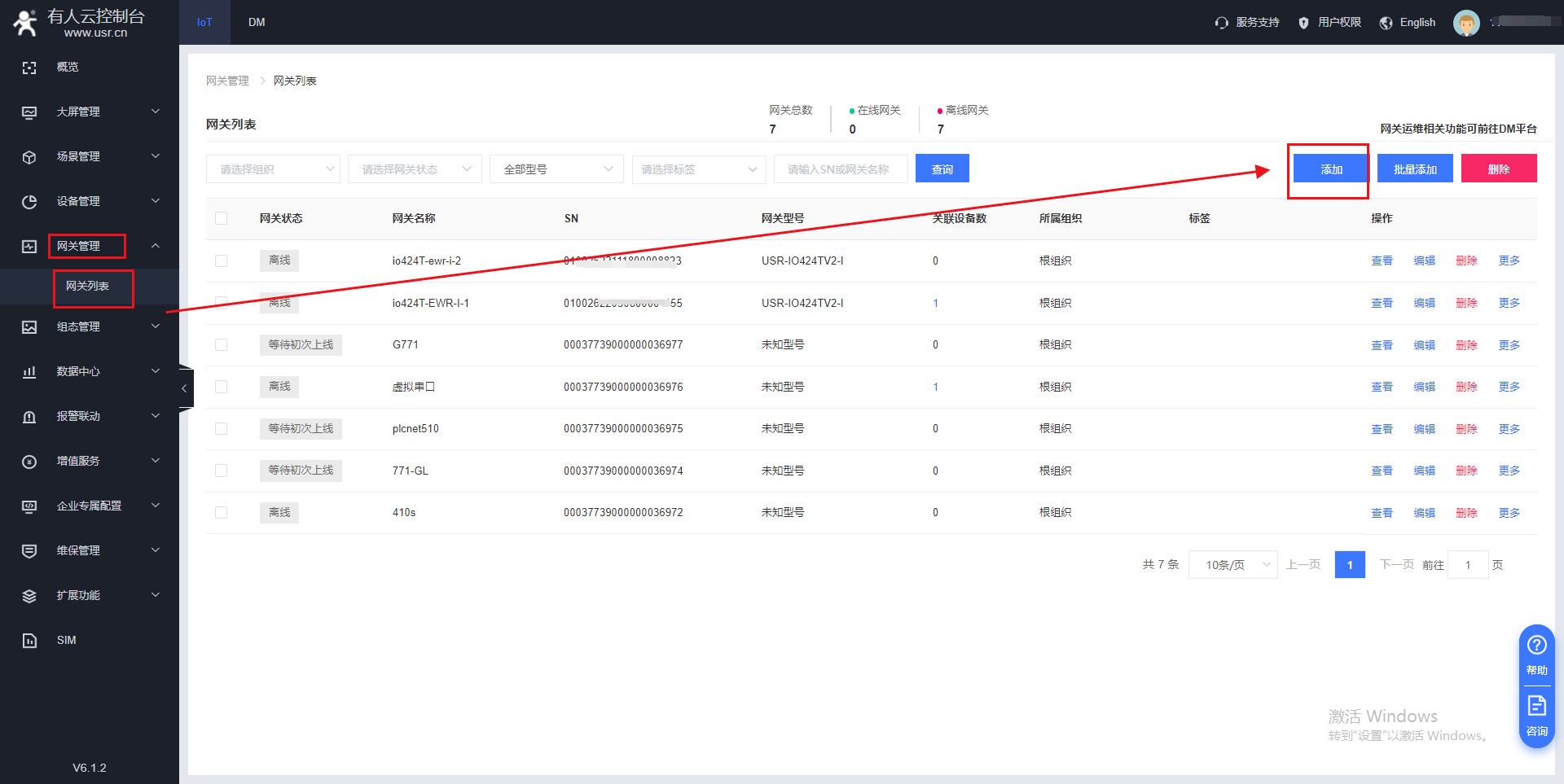 (1)云平臺添加網關,在網關管理---網關列表--添加,點擊SN不支持,系統自動生成,不需要客戶自己設置,通訊密碼可以自定義8位密碼.(建議使用系統自動生成的通訊密碼)