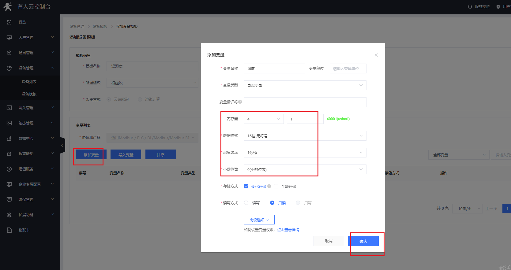 2)在設備管理---設備模板界面添加需要采集的從機變量點。寄存器信息需要與串口設備進行匹配。(測試用modbus savle 軟件模擬modbus rtu485設備,采集變量40001、40002)