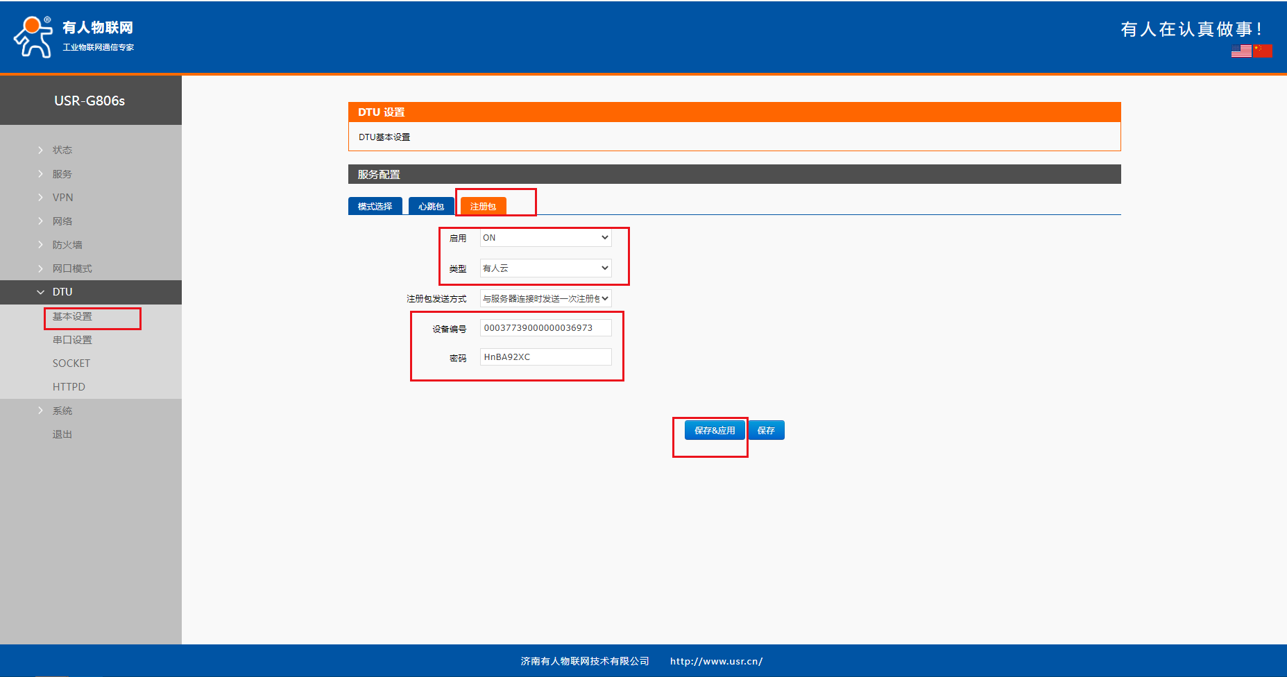 在DTU---基本設置---心注冊包,注冊包類型選擇有人云,設備編號和密碼填寫云端自動分配的。