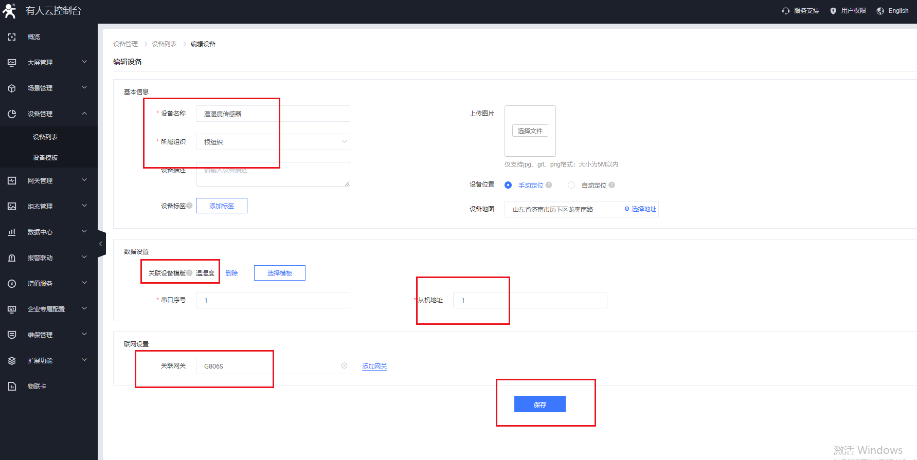 7、在設備管理--設備列表的界面添加一個設備,把設備模板和網關進行關聯,并配置串口終端設備的從機地址。(測試從機地址設置為1)