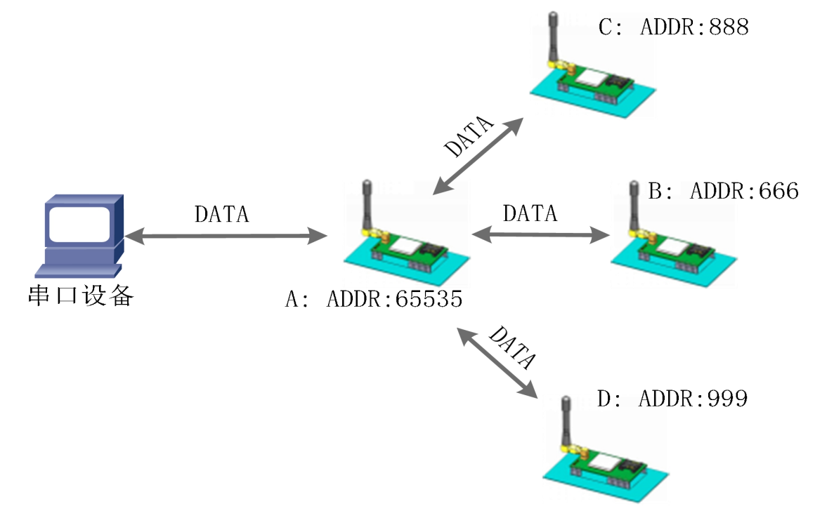 當模塊的地址為 65535 時,此模塊可以和其他同速率、同信道、同組號的模塊進行廣播發(fā)送和廣播接收。如圖示將 A 模塊的地址設 置為 65535,此時 A 模塊發(fā)出的數(shù)據(jù)其他 3 個模塊均可接收,同時其他三個模塊發(fā)出的數(shù)據(jù) A 模塊也能接收。