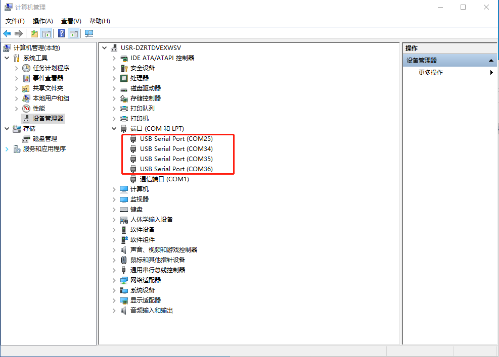 電腦鼠標點擊計算機管理,右擊,點開設備管理器,點擊端口,查看接4個WH-L101-L-H20的USB-RS232串口線COM口號。