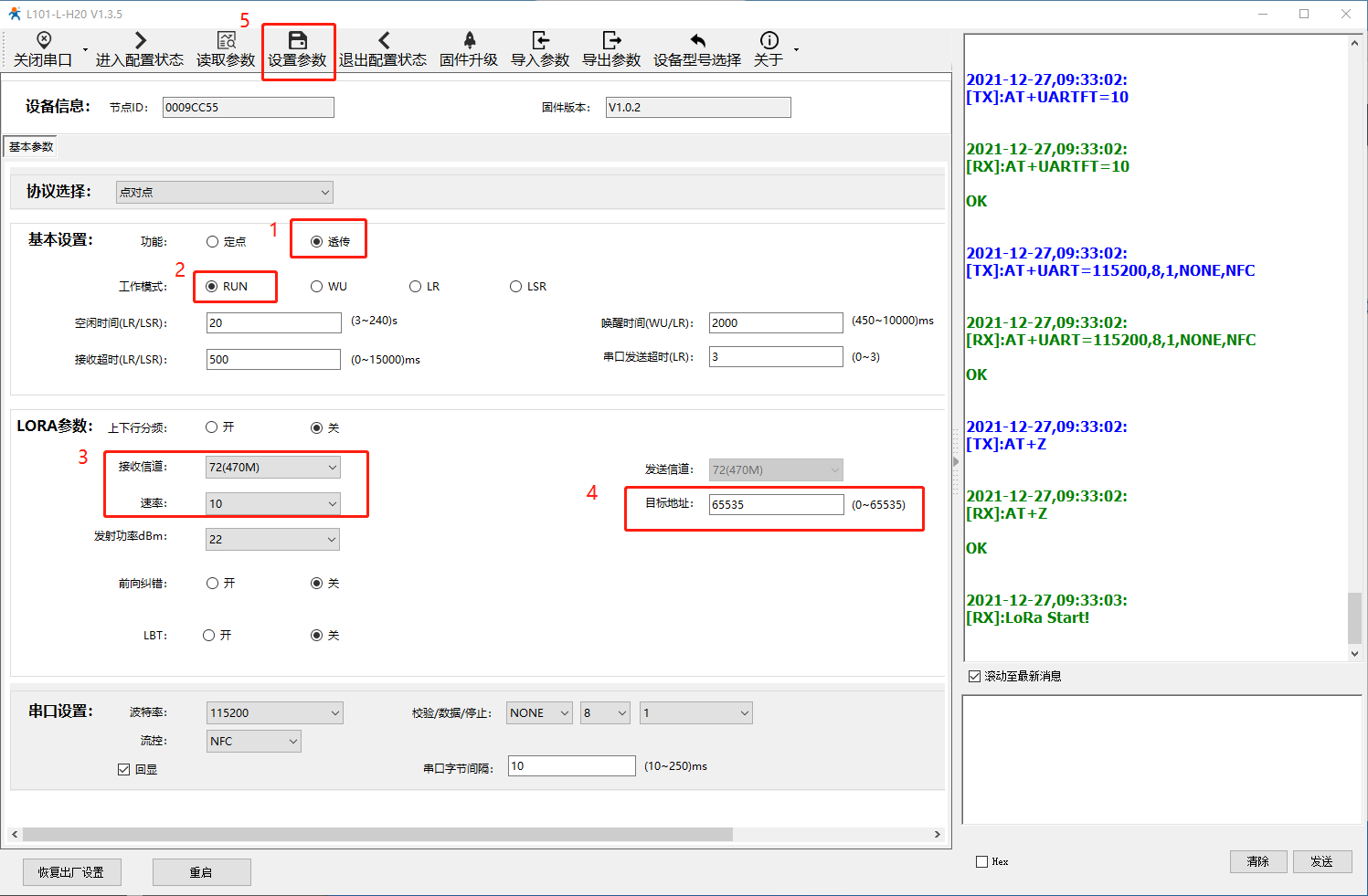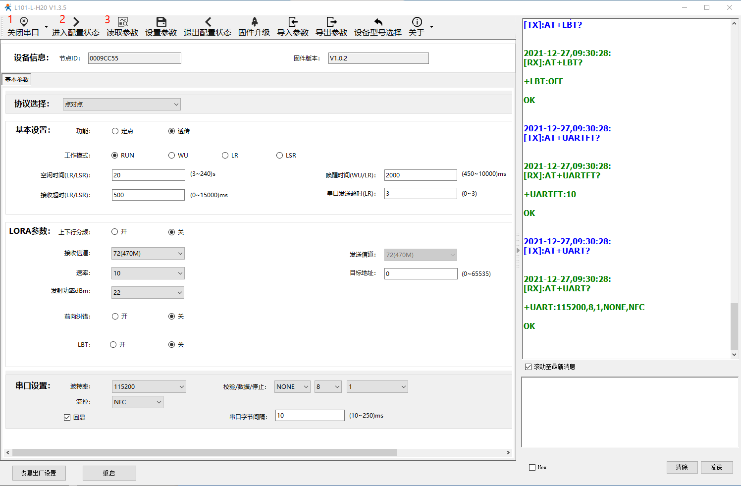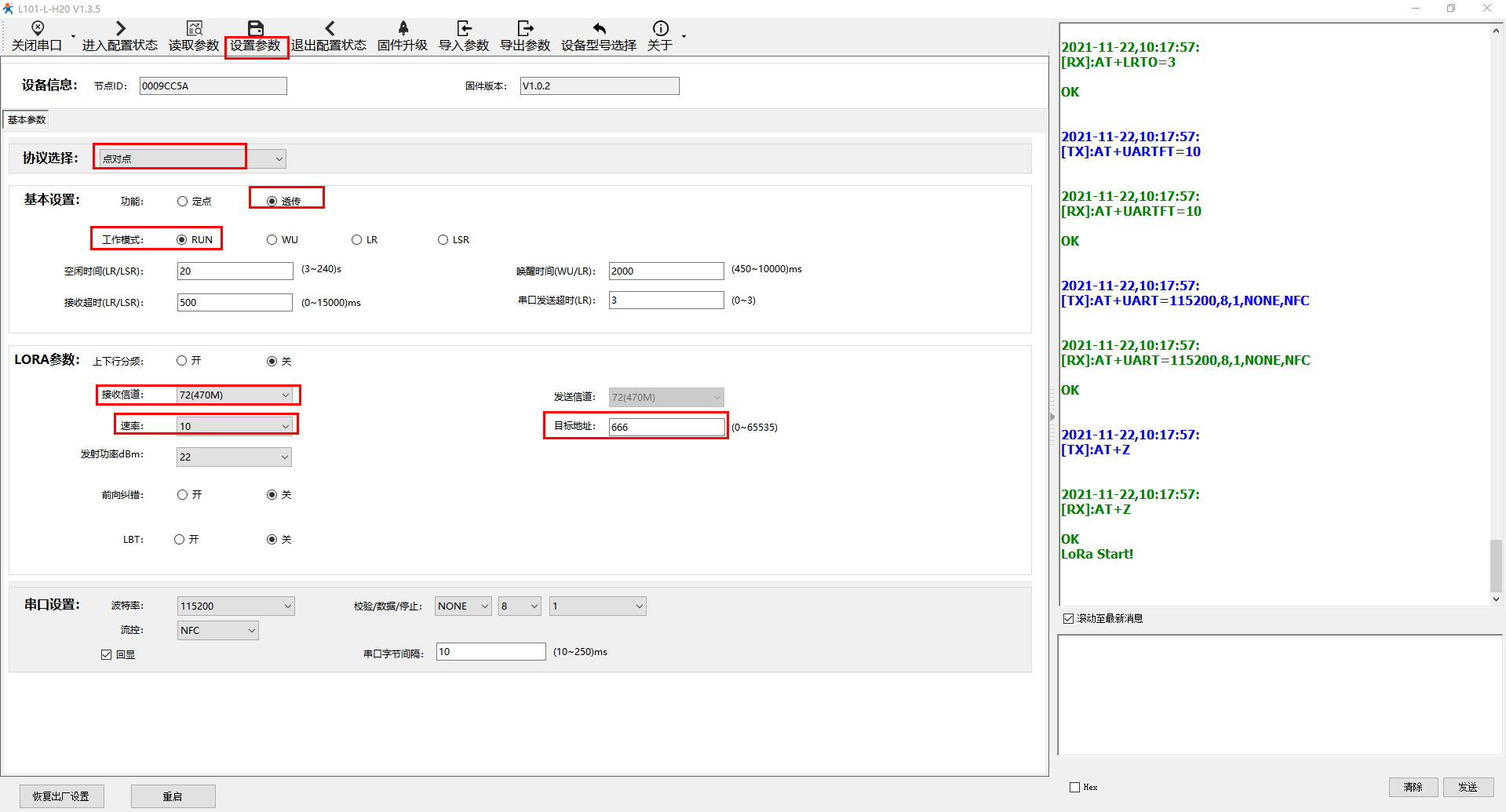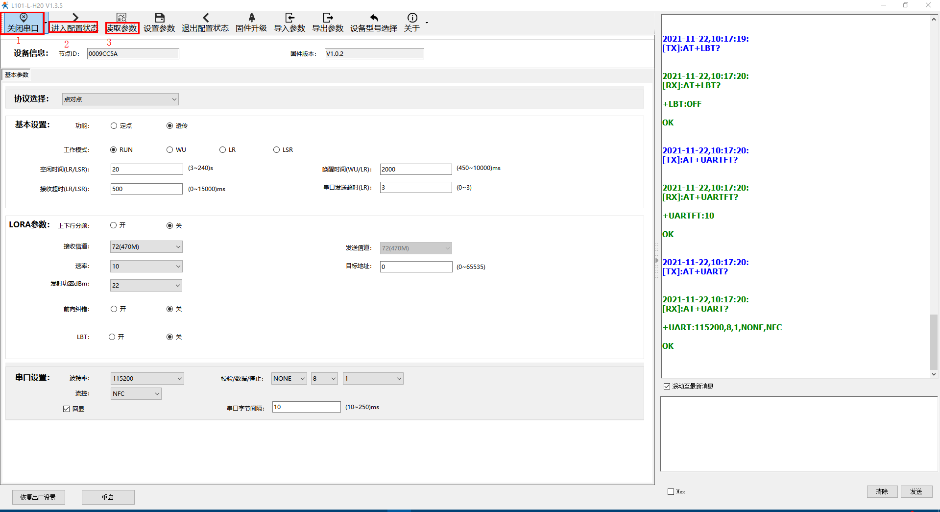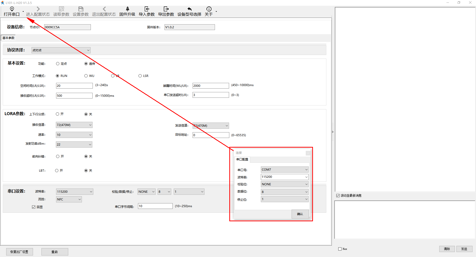 上電第一次,默認串口參數(shù)波特率115200、無數(shù)據(jù)位、數(shù)據(jù)位8、停止位1,打開對應101的COM口,點擊進入配置狀態(tài),讀取參數(shù)。然后設置透傳功能,信道72,速率10,目標地址65535。最后點擊設置參數(shù)。