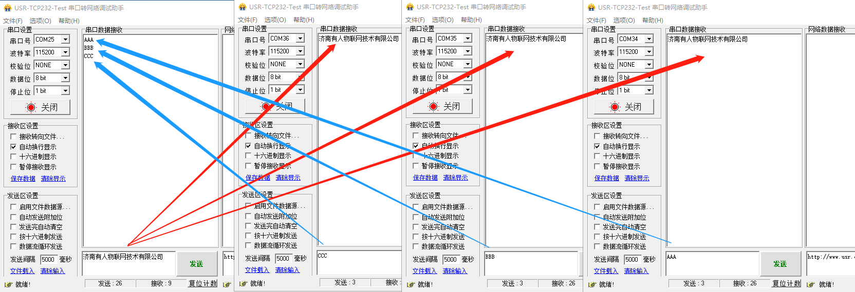 電腦打開4個USR-TCP232-TEST串口軟件,打開對應4個WH-L101-L-H20的USB-RS232串口線COM口號,A號WH-L101-L-H20發(fā)送數(shù)據(jù),另一個3個WH-L101-L-H20均可接收數(shù)據(jù)。B/C/D模塊發(fā)送數(shù)據(jù),只有A模塊可以接收到。