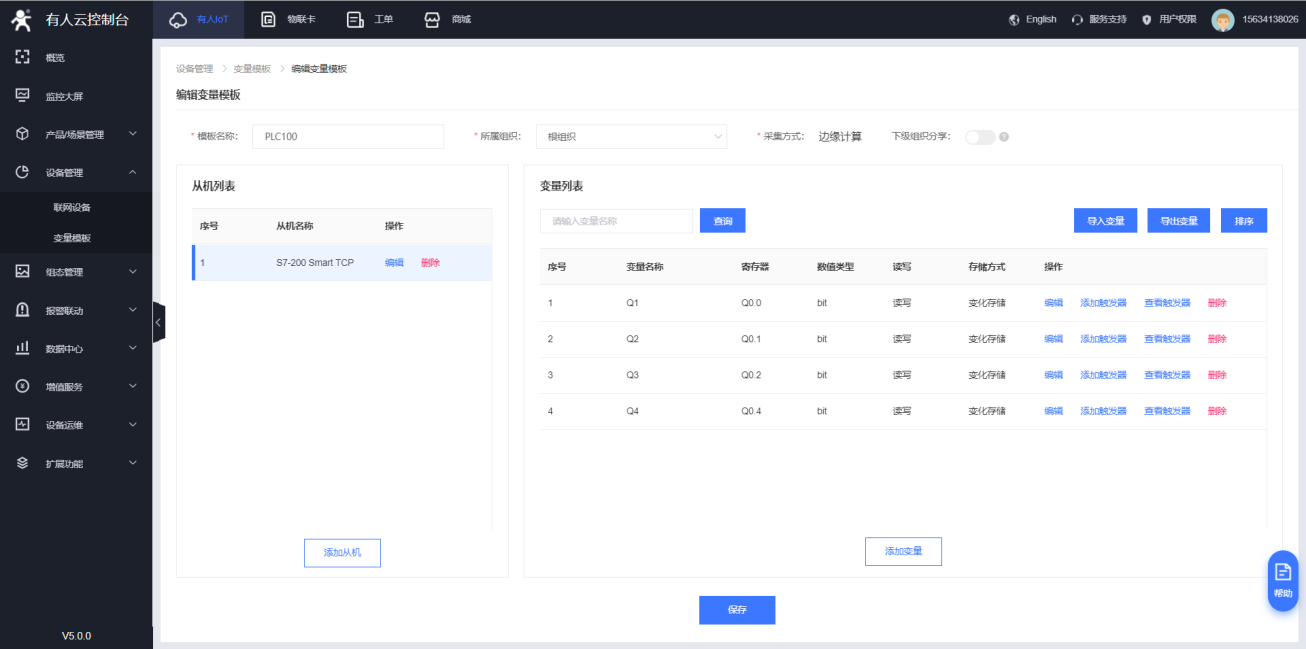 4.變量模板選擇選擇modbus/PLC->有人->PLC100 TCP,采集方式為邊緣采集