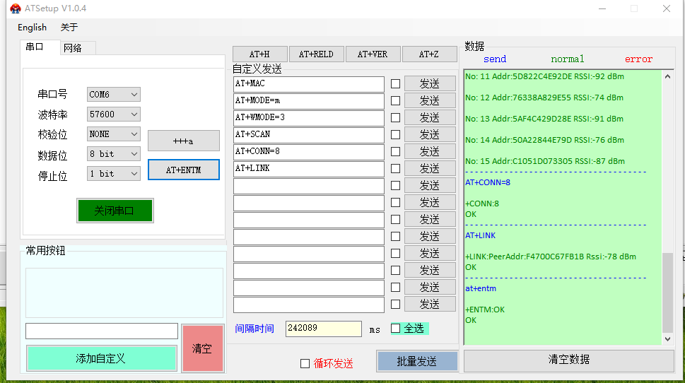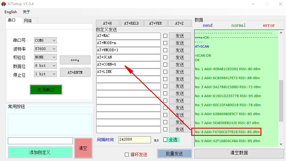 (3)根據掃描結果進行連接,發送AT+CONN=8