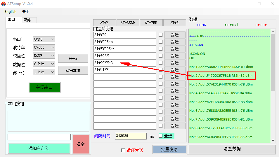 (3)根據掃描結果進行連接,發送AT+CONN=2