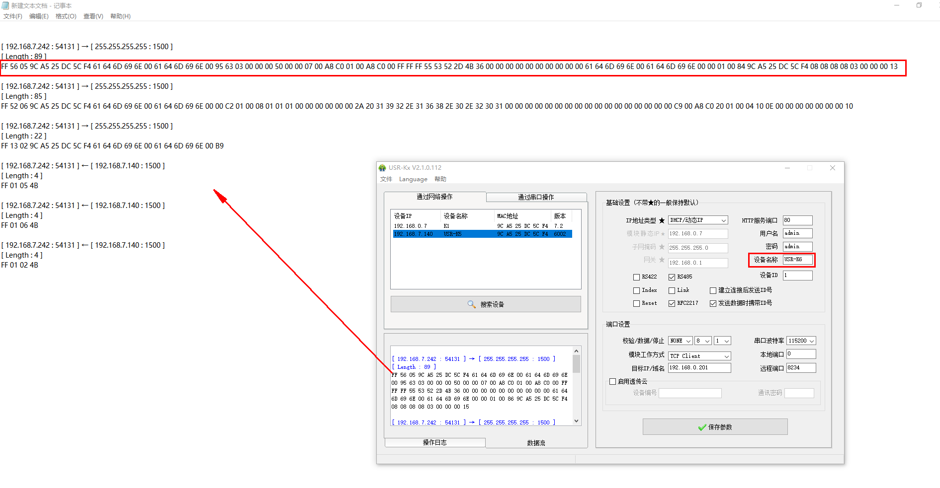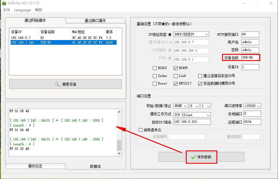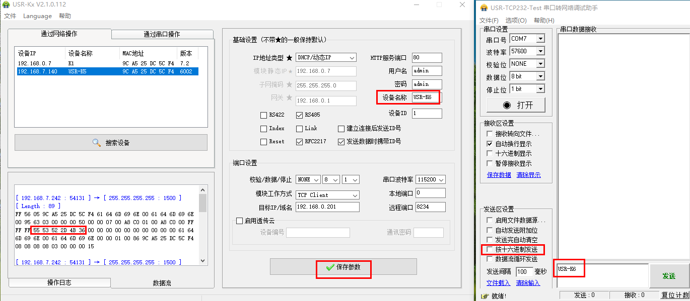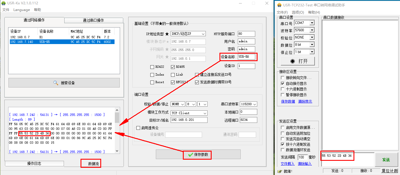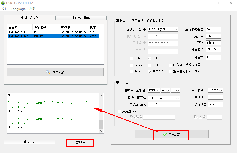 二、USR-K5使用USR-Kx軟件,點擊保存參數,數據流可以查看對應的網絡協議。