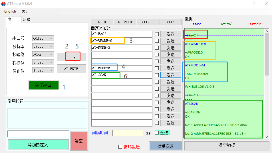 準備兩個BLE106,106串口接電腦,上電,打開AT指令配置軟件分別配置兩個模塊參數。(一個為主機模式、一個為從機模式)