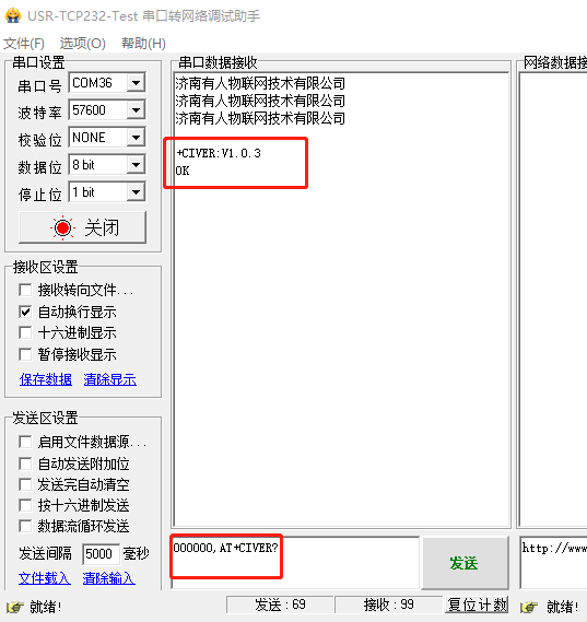 關閉AT指令設置軟件的串口后打開串口測試軟件,可以進行數據透傳通信測試。
