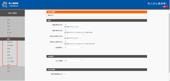 2、默認開啟有人云服務功能。界面可以配置流量統計、網絡監測、參數配置、固件升級、等有人云特殊功能