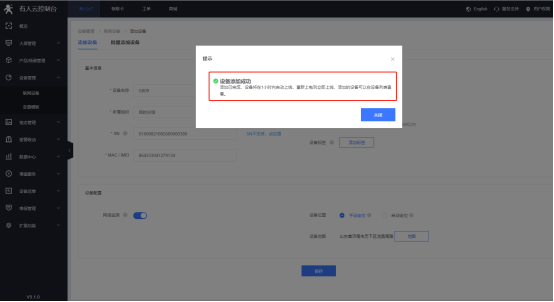 5、設備添加完成,設備將在1小時內自動上線,重新上電則立即上線,添加的設備可以在設備列表查看,至此在有人云上添加設備完成