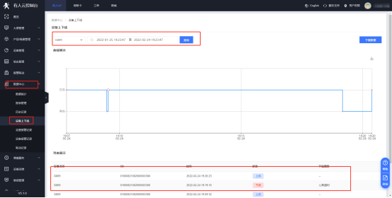 (4)在“數據中心”--“設備上下線”界面中可以查看相應設備的上下線記錄,同時數據支持下載成EXCEL表格保存至本地