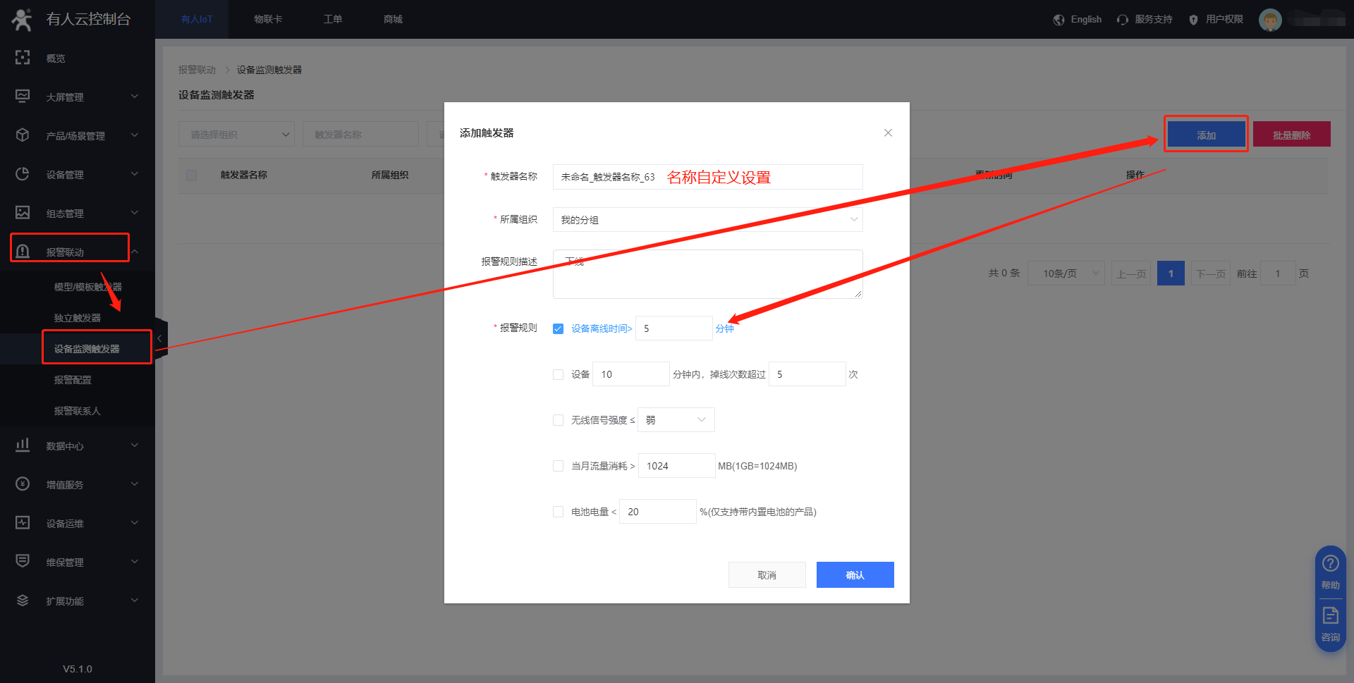 (3)在“報警聯動”--“設備監測觸發器”界面中可以對G809設備進行相應的報警設置,比如頻繁下線告警、信號強度過弱報警,到達設定值可以看到報警提示。