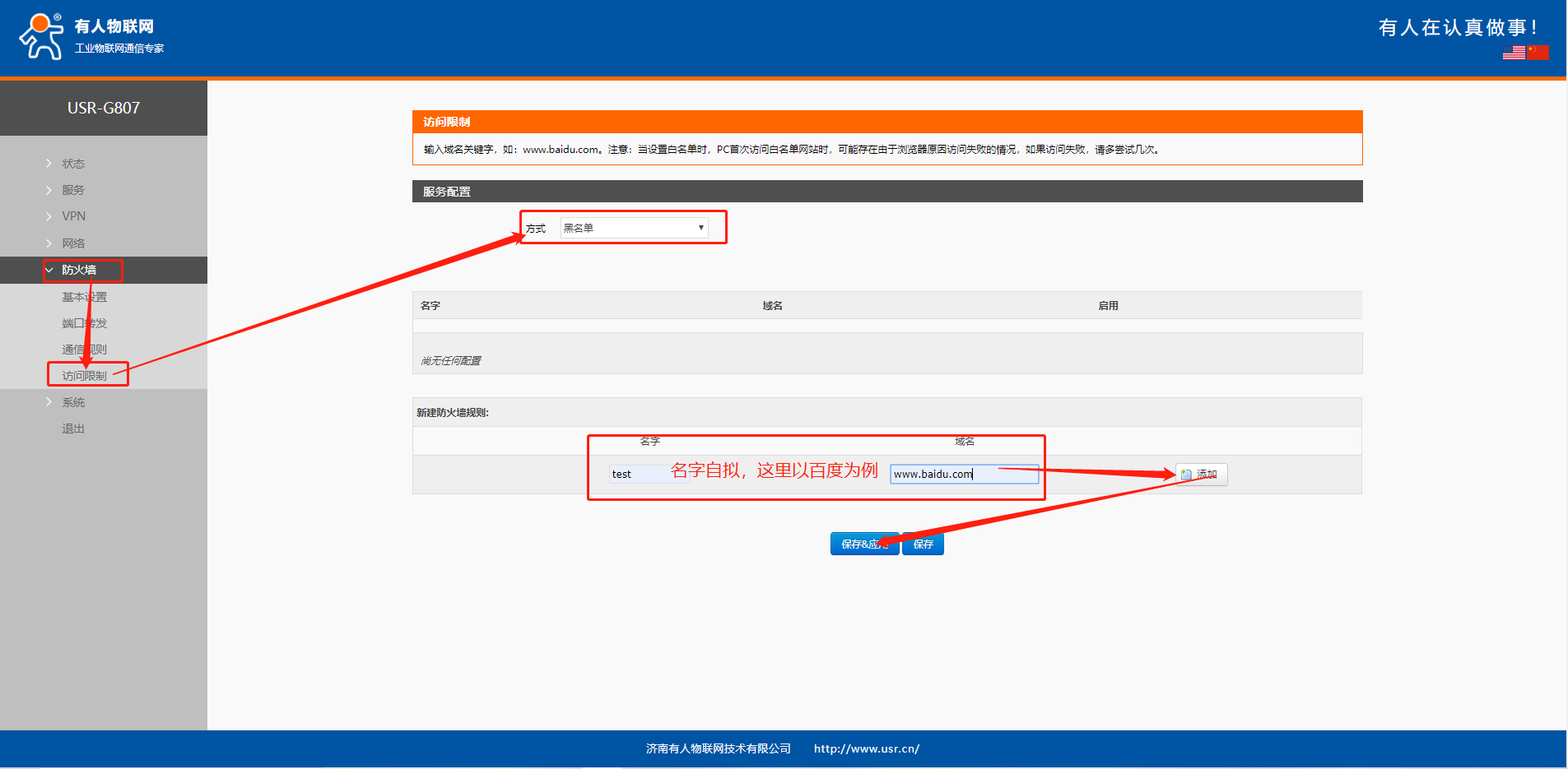 <1>方式選擇黑名單,新建防火墻規則中名字可自擬,域名即為要禁止的正確域名,點擊添加,然后點擊報保存,規則立即生效