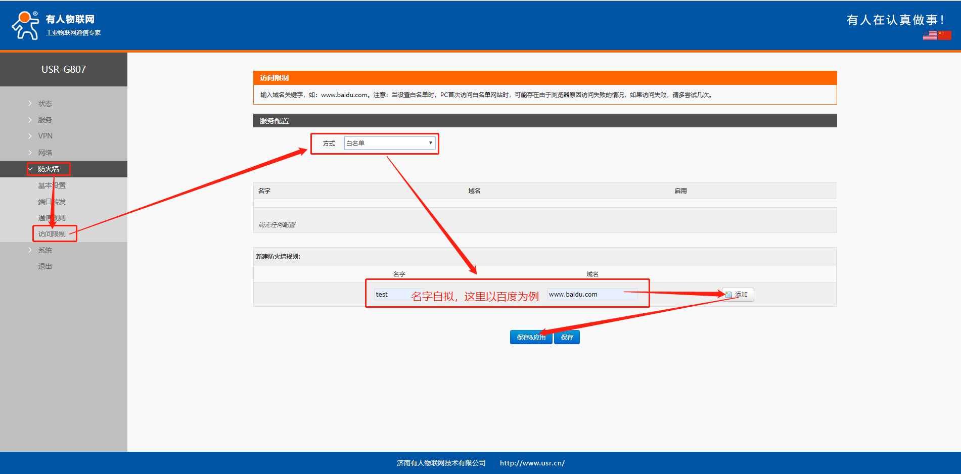 <1>方式選擇白名單,新建防火墻規則中名字可自擬,域名即為要放行的正確域名,點擊添加,然后點擊報保存,規則立即生效
