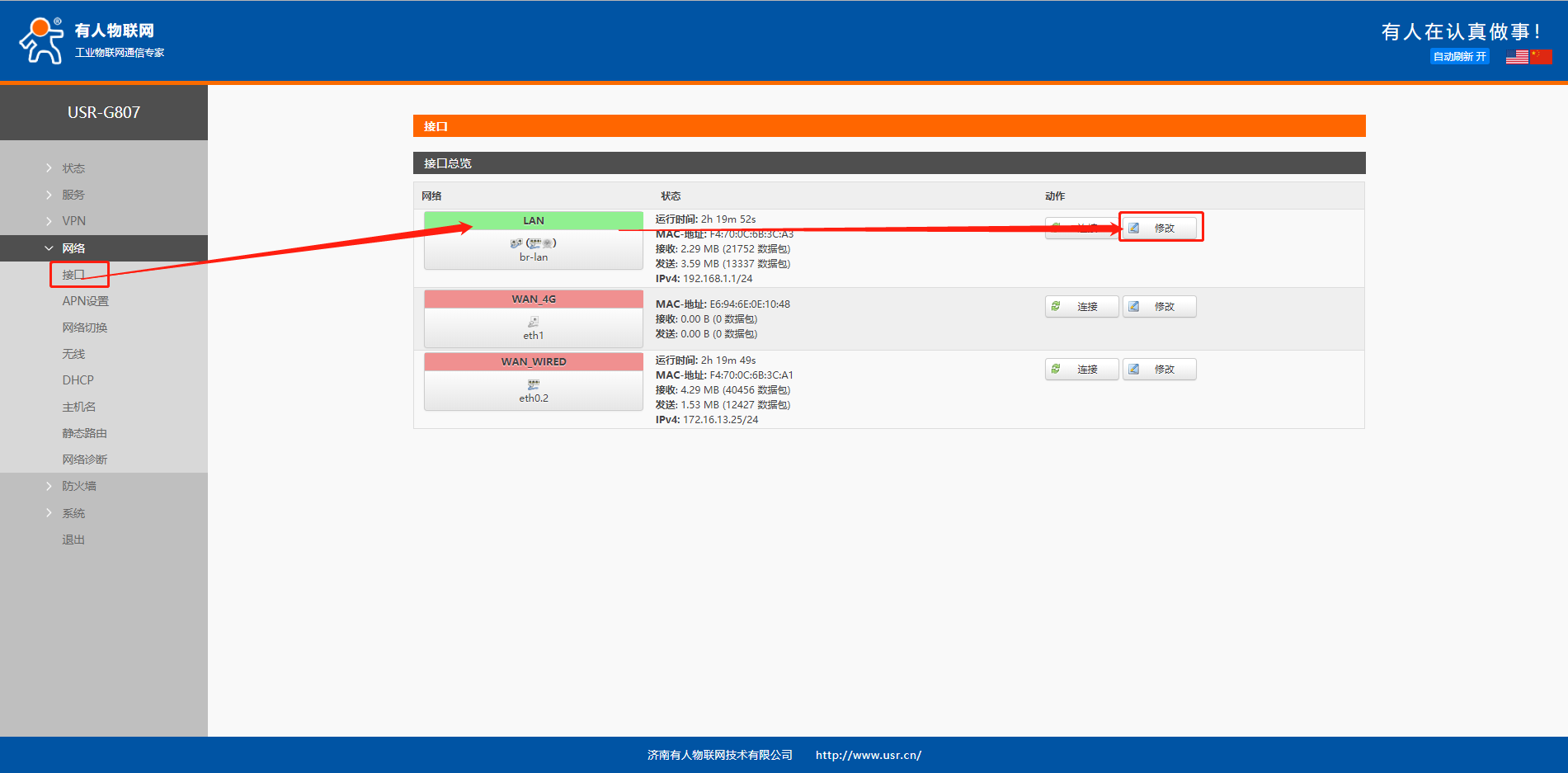 3、進(jìn)入網(wǎng)絡(luò)--接口界面,點(diǎn)擊LAN口對(duì)應(yīng)的修改按鈕,進(jìn)入修改界面