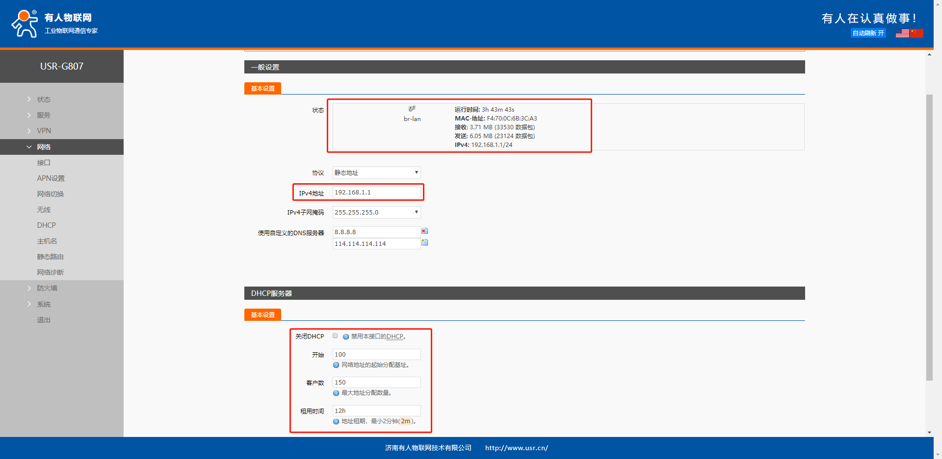 4、路由器G807默認(rèn)出廠LAN IP為192.168.1.1,以及默認(rèn)開啟DHCP功能等,可以在此界面修改LAN參數(shù)