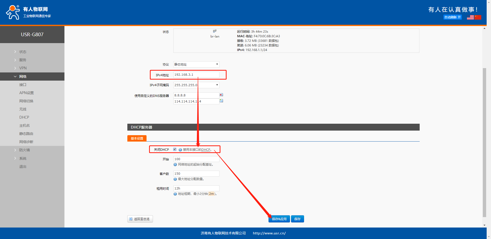5、這里我們測(cè)試修改一下LAN網(wǎng)段,將LAN口改成3網(wǎng)段,網(wǎng)關(guān)地址192.168.3.1。以及關(guān)閉LAN口的DHCP功能。DHCP功能為動(dòng)態(tài)分配IP功能,若關(guān)閉則路由器無法給下級(jí)自動(dòng)分配IP,下級(jí)設(shè)備需以相同網(wǎng)段和網(wǎng)關(guān)的IP靜態(tài)接入才能獲取網(wǎng)絡(luò).修改完成后點(diǎn)擊下方保存并應(yīng)用按鈕