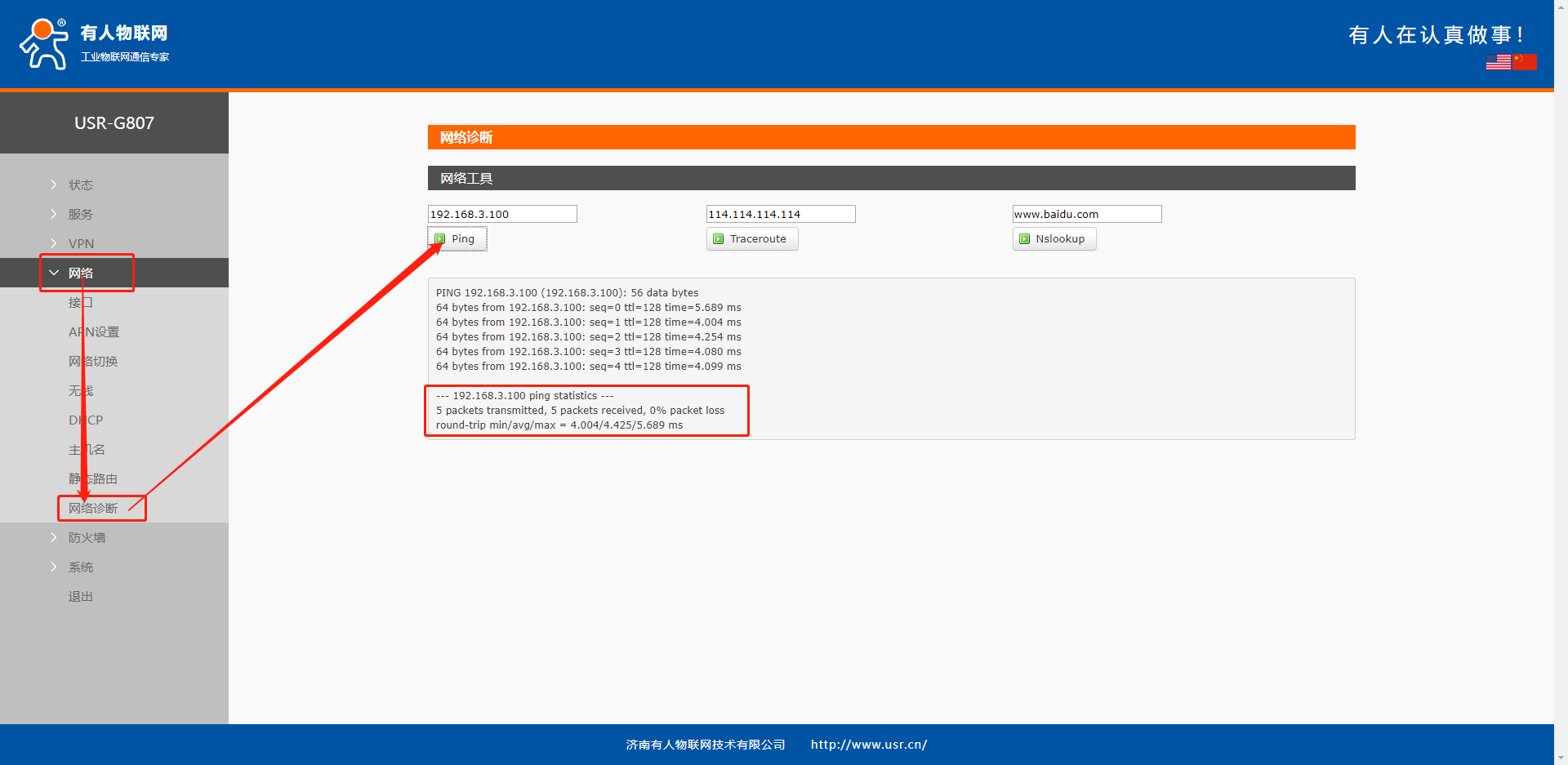 8、進(jìn)入之后在網(wǎng)絡(luò)--網(wǎng)絡(luò)診斷界面ping一下電腦IP:192.168.3.100,能通也說明網(wǎng)絡(luò)是通的